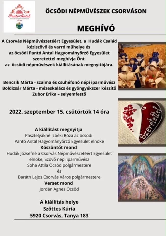 2022.szeptember 15-én, csütörtökön nyitjuk három tárgyalkotó népművészünk kiállítását a Békés megyei Csorváson.