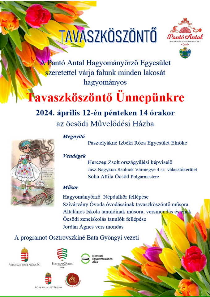 A Pantó Antal Hagyományőrző Egyesület immár harmadszorra rendezi a kedves hagyománnyá vált sikeres Tavaszköszöntő ünnepét, melyre a fellépő gyerekekkel, a felkészítő pedagógusokkal és Népdalkörünkkel együtt szeretettel hívjuk és várjuk a falu lakosságát.