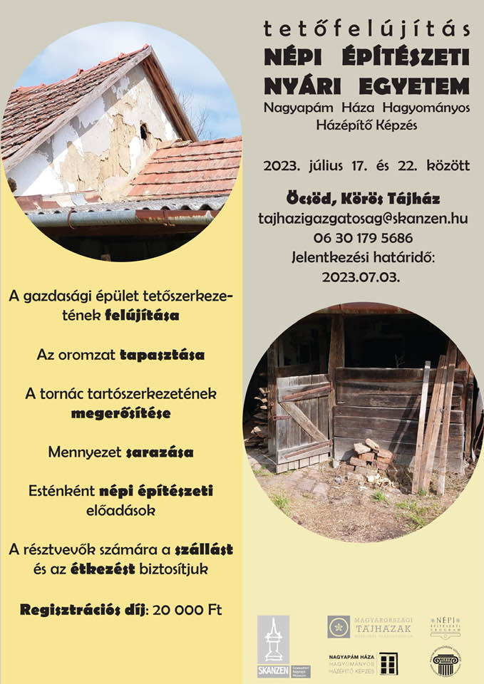 Kedves Tájházbarátok! A mai napon elindult az idei Népi Építészeti Nyári Egyetem Öcsödön, a Körös Tájház portáján. Ezen a héten a lakóház mögötti gazdasági épület tetőszerkezetét újítjuk meg a lelkes résztvevők közreműködésével. Ezen kívül tapasztási és meszelési munkákat fogunk végezni.